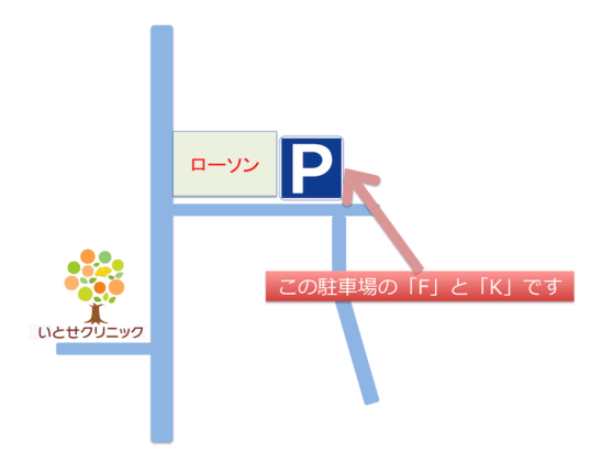 またクリニックななめ向かいのローソンさん裏の駐車場「F」と「K」が使用できます。他の区画は月極で契約者がいらっしゃるので、「F」「K」以外には絶対に駐車しないようお願いします。なお、駐車場内でのトラブルについては当クリニックでは責任を負いかねますのでご了承ください。